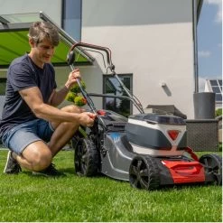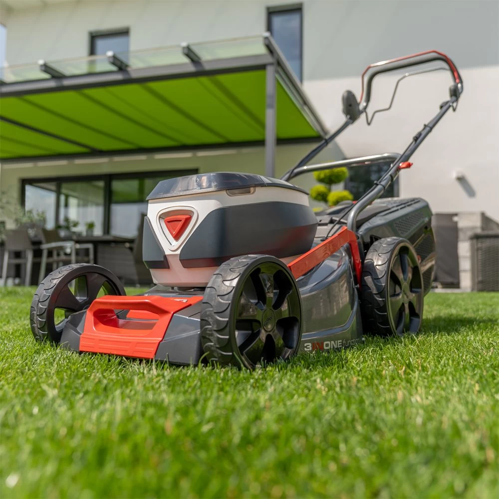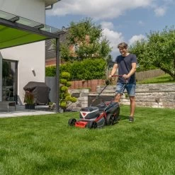 Thanks to the latest dual lithium-ion battery technology with balanced discharging, the battery-powered lawn mower combines the advantages of a classic petrol machine with the quiet and exhaust-free operation of an electric device – all cable free. After a two hour charge time, the mower is simple to start with a plug-in key.