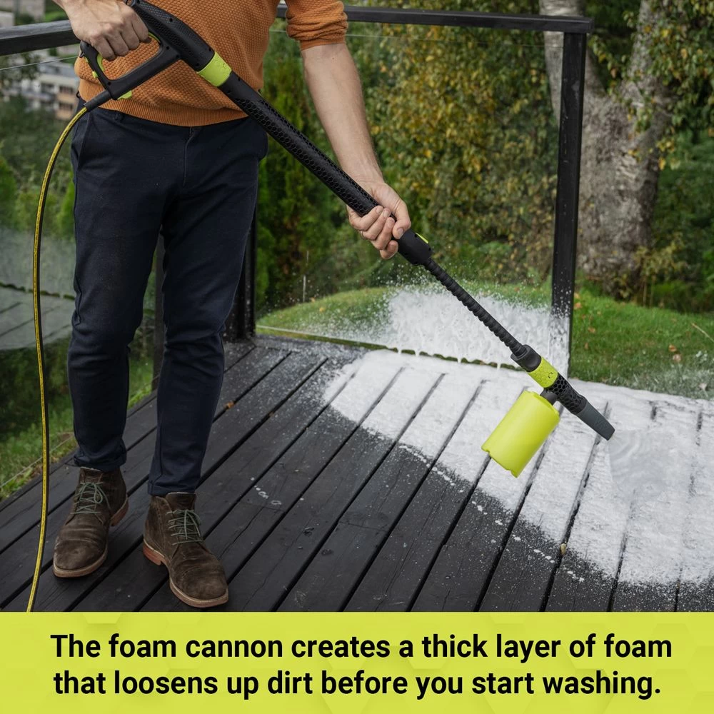 - Basic foam cannon with 0.8 litre soap bottle – creates a thick layer of long-lasting foam that clings to every surface. Exactly how much foam the cannon sprays can be adjusted
