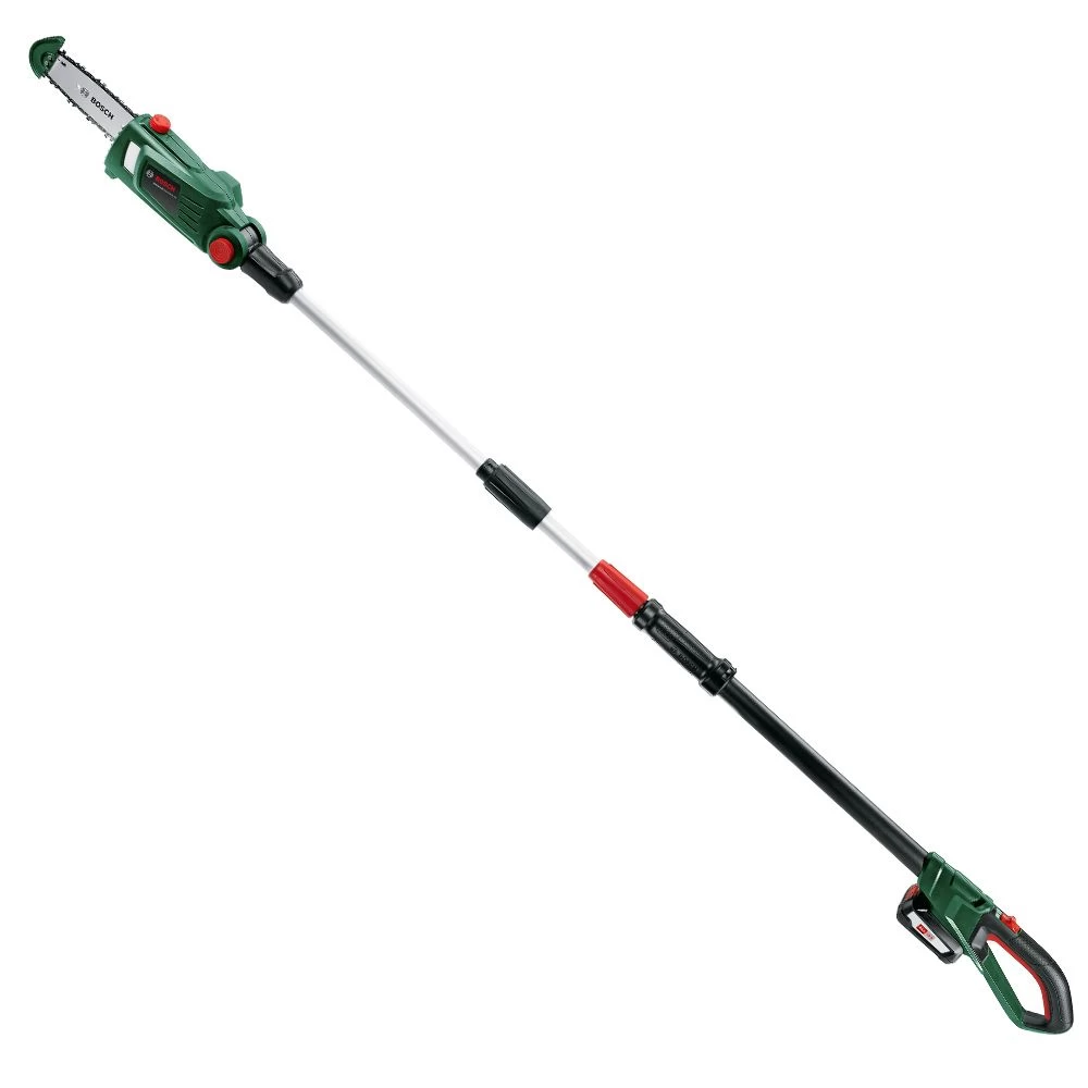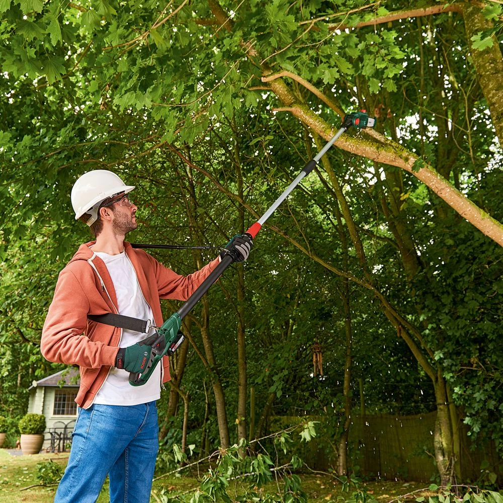 Powered by a Bosch POWER FOR ALL 18V 2.5Ah battery, the pole saw features a telescopic head and pivoting head. The well-balanced, leightweight and ergonimic design minimises strain on arms and shoulders, whilst the tip protector and bumper spike offer maximum control while cutting and undercutting.