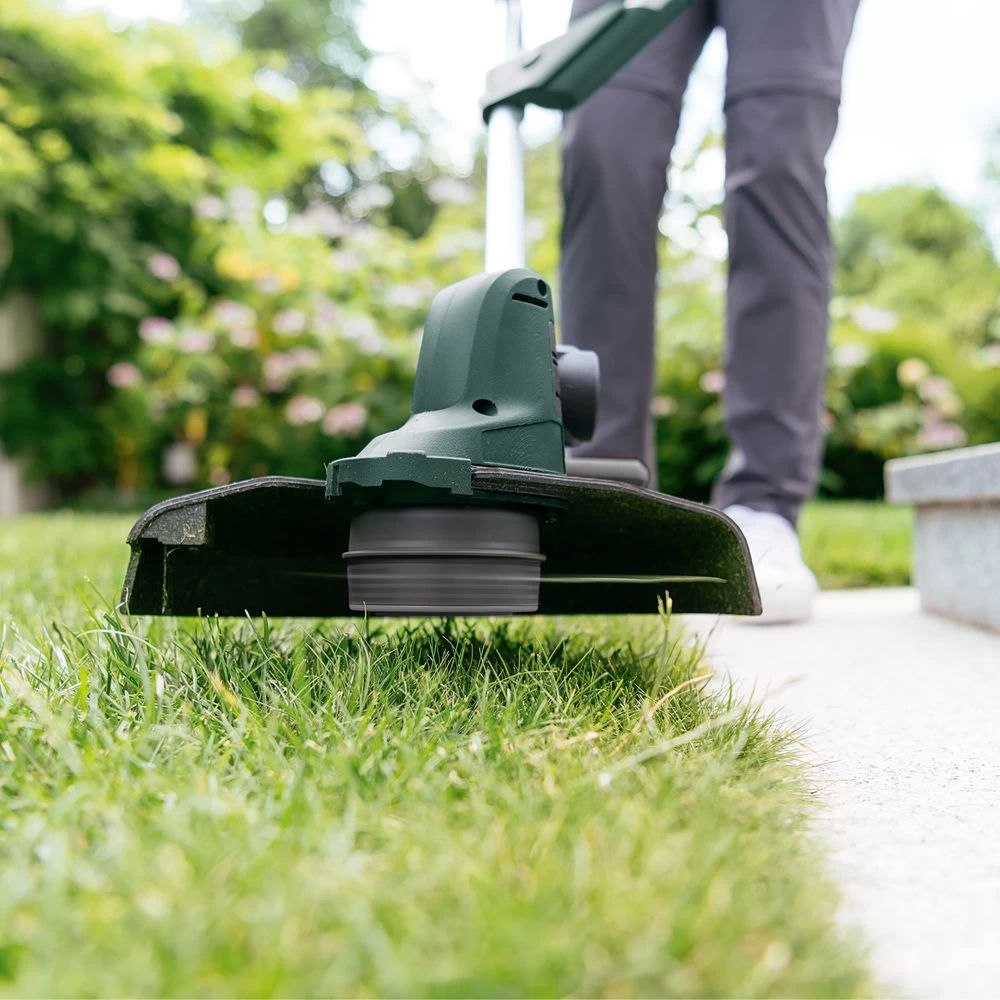 The IntelliFEED function automatically feeds the spool line, eliminating stops, bending, and bumping. The versatile head rotates through a foot pedal button and handle twist, for easily switching from trimming to edging. Its plant protector feature gently shields flowers when working around flowerbeds.