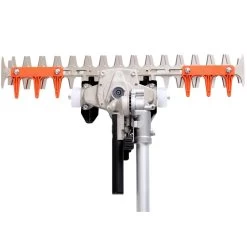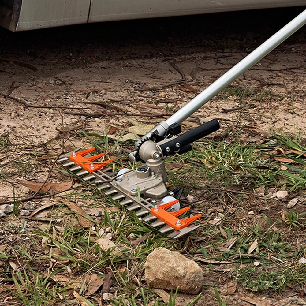 The 464mm-wide cutting head sits on two wheels and sleds, which allow smooth and effortless operation on both flat and uneven surfaces. Large areas can be trimmed by sweeping back and forth, whilst the angle of the gearcase can be adjusted for maximum comfort when operating. The auto-boost function helps to clear thick grass and brush. The double-sided blades with 30mm tooth spacing can be removed for easy maintenance.