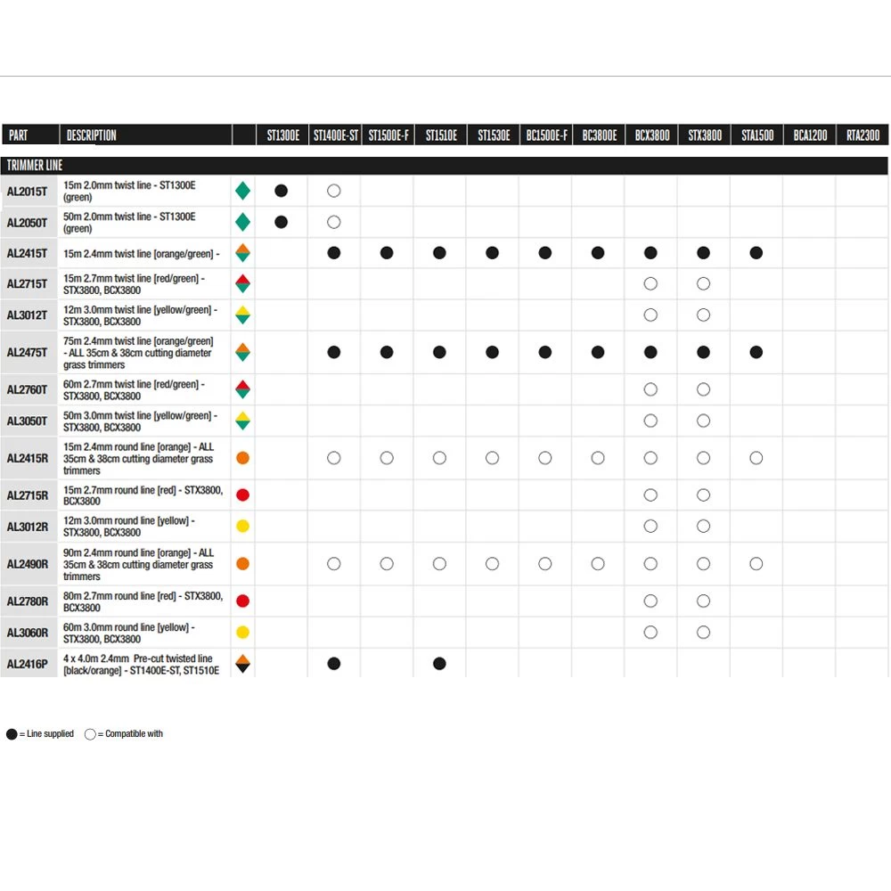 The EGO Power+ STX3800 is equipped with a manual wind bump feed head fitted with 2.4mm dual nylon line which gives a 38cm cutting width but the line feed head is capable of housing line up to 3mm in diameter.