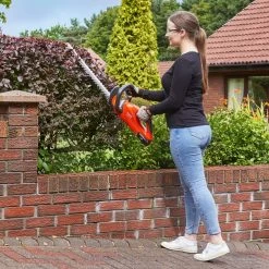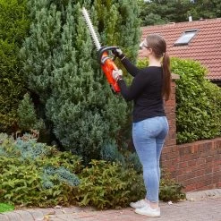 The Flymo EasiCut 450 is equipped with laser-cut, dual-action 45cm (18″) blades which create a cleaner cut and finish on your hedges, while the 16mm tooth gap indicates the maximum diameter the trimmer can cut through. The blade tip protector is designed to protect the tip of the hedge trimmer’s blade from wear and tear while working in contact with the ground.