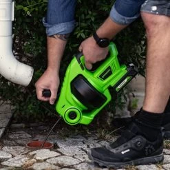 The GreenWorks 24V drain auger features a lightweight and cordless design making it portable and more practical for freely working to dredge and unblock drains.