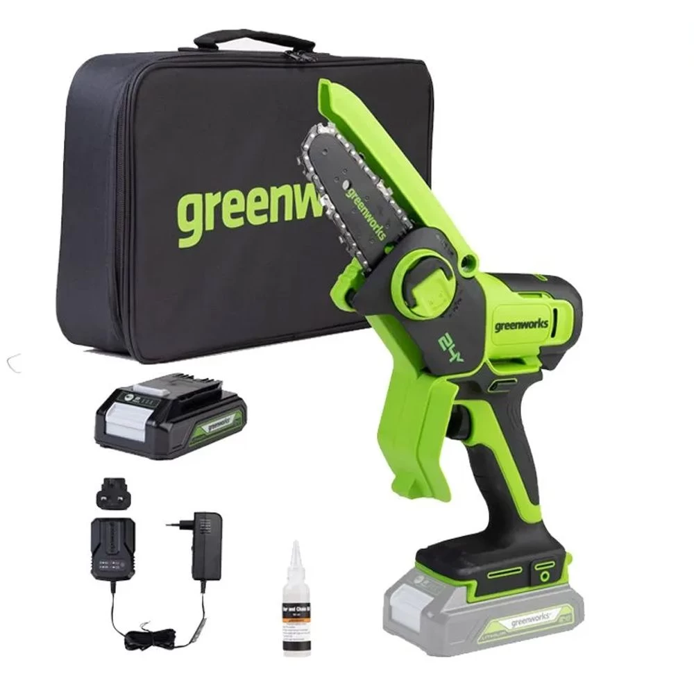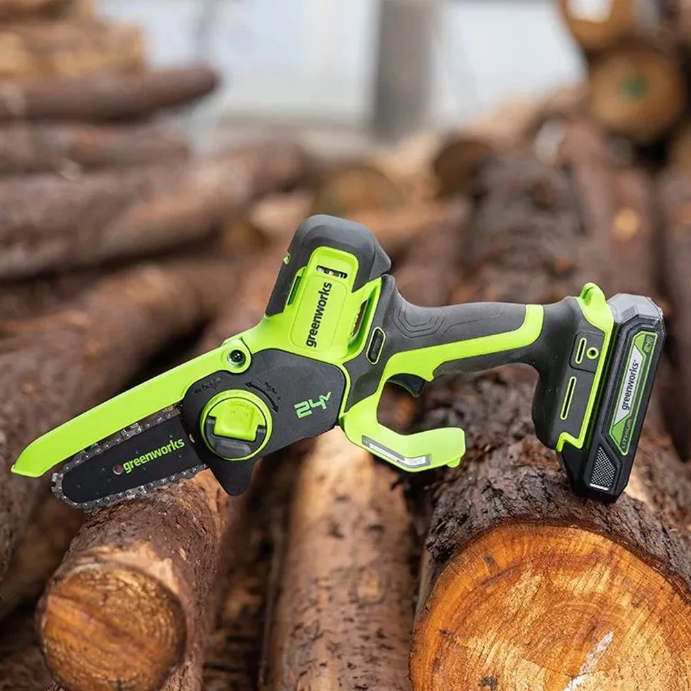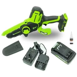 The GreenWorks 24V 10cm (4”) pruning saw / mini chainsaw combines a range of excellent features, in the smallest unit of its type, at a very good price point.