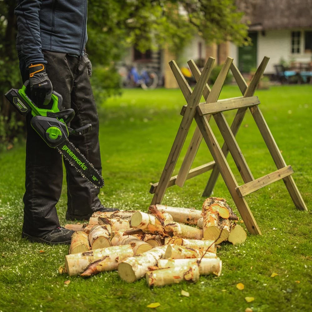 The GreenWorks GD24CS30 is a robust, lightweight 24V chainsaw designed for home and DIY tasks. Powered by an advanced 24V lithium-ion battery (not supplied with this bare tool), the chainsaw offers high performance despite its compact size. Convenience is guaranteed with no fuel or electric cables to contend with, simply insert the battery and you are ready to cut.