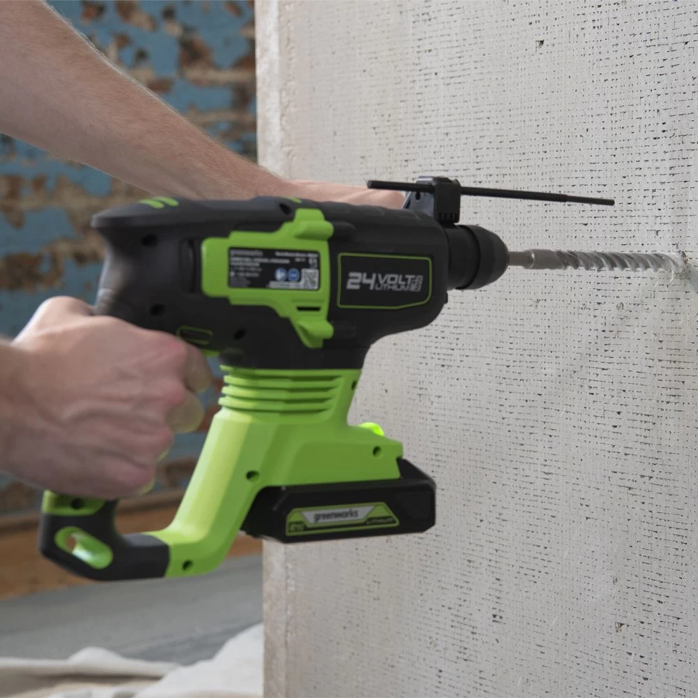 The GreenWorks GD24SDS1 brushless hammer drill is a robust, lightweight and powerful 24V hammer drill designed for home and DIY tasks. Powered by an advanced 24V lithium-ion battery, the machine offers high performance despite its compact size. Convenience is guaranteed with no electric cables to contend with, simply insert the battery and work.