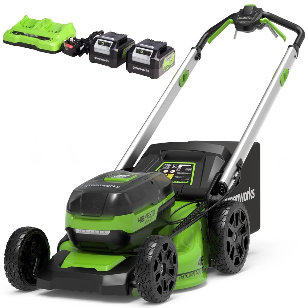 The GreenWorks GD24X2LM46SP4K4K is a feature-packed self-propelled lawn mower kit with a 46cm cutting width for medium to large sized lawns. Powered by an advanced quadruple battery system and part of the 24V family, the battery can be used in any of the other tools available, for total flexibility and convenience.