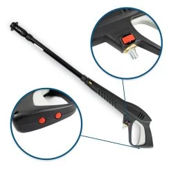 The comfortable handles and sturdy wheeled design mean that you can simply wheel the pressure washer to where it is needed, and its hose and lance holder make it easy and convenient to store.