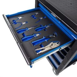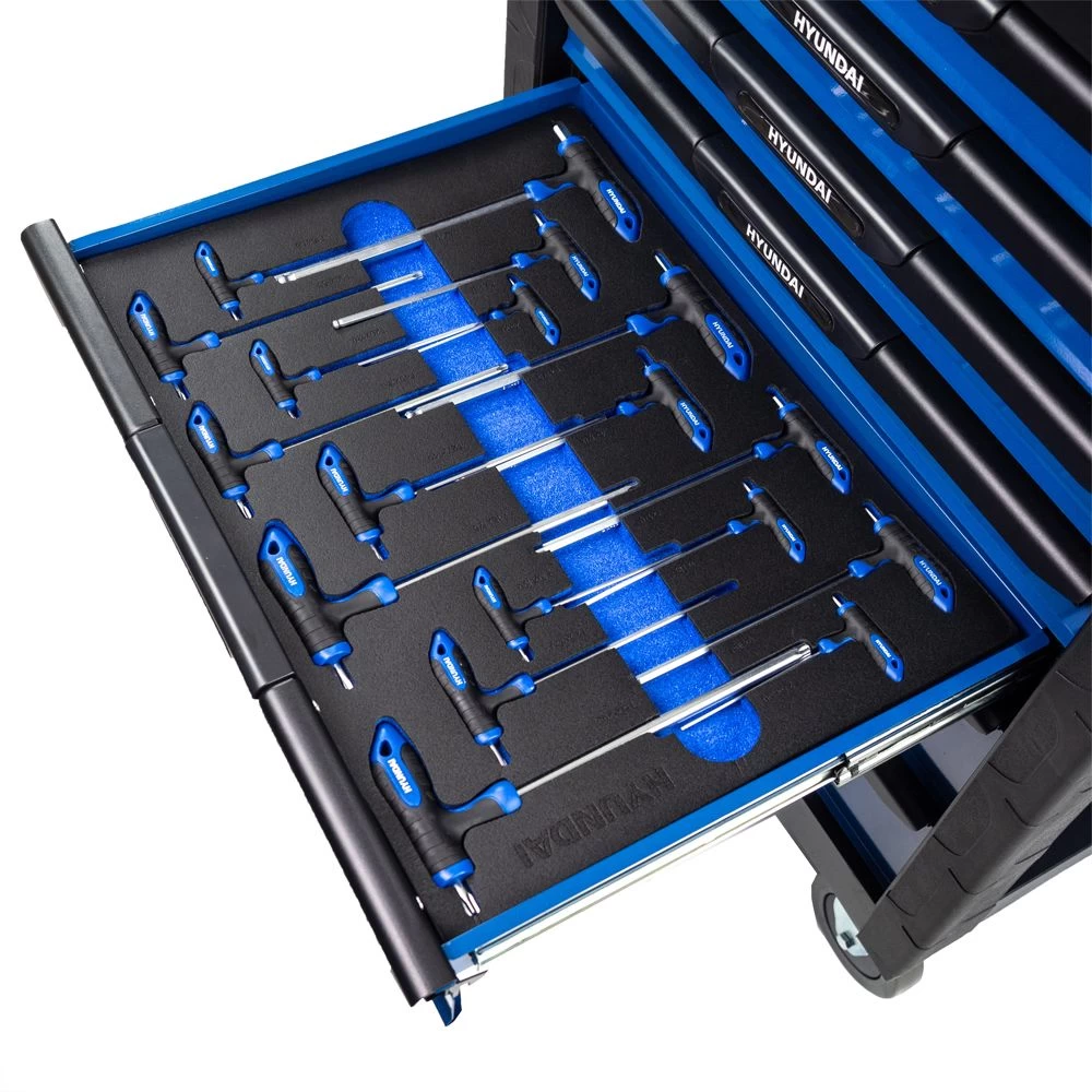 Designed for mechanics both home and professional, the HYTC9006 is a seven drawer caster-mounted tool chest from Hyundai. Each drawer features a super smooth ball bearing mechanism that glides open effortlessly, all drawers include a liner to protect your tools from slipping.