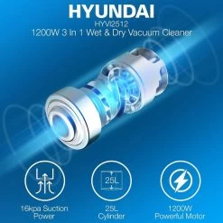 The HYVI2512 is a powerful electric wet and dry vacuum cleaner from Hyundai. Powered by a 1200 watt air-cooled Hyundai electric motor, this vacuum cleaner has a massive 16kpa suction power and is capable of the most demanding cleaning jobs around your home or workshop.