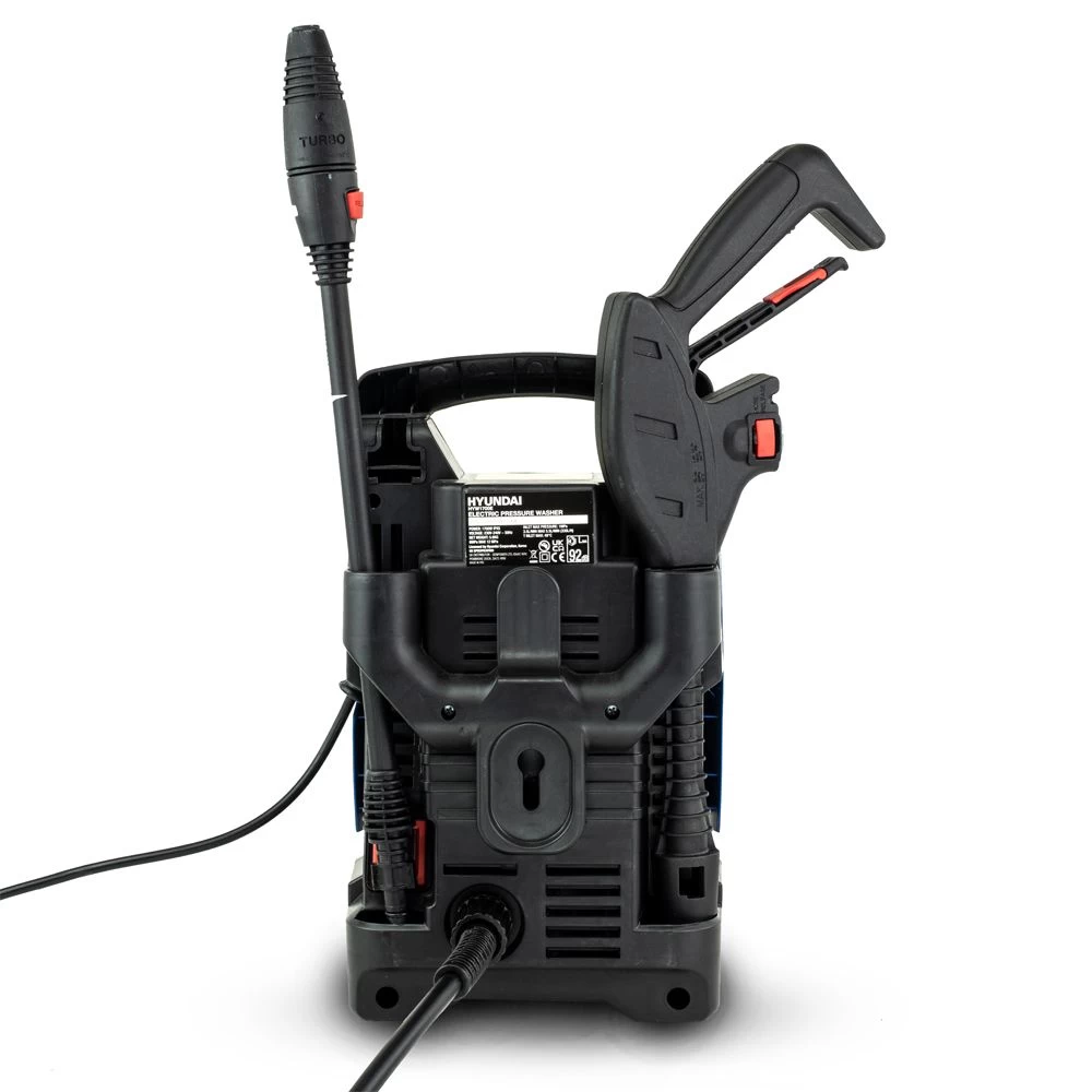 Designed with efficient storage and ease of use in mind, the Hyundai HYW1700E high-pressure washer features designated spaces on its main body for storing the gun, lance, hose, attachments, and the electrical cable whilst the washer is not in use.