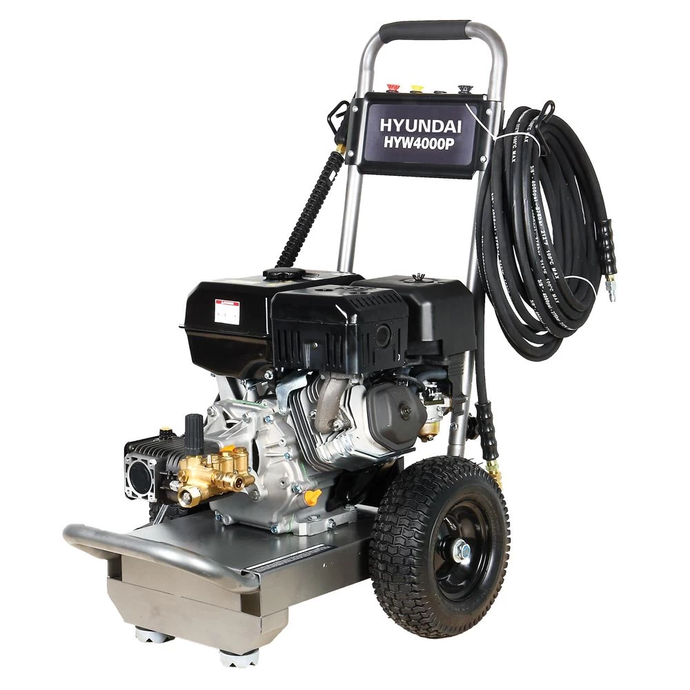 The HYW4000P is a petrol-powered pressure washer powered by the 420cc 14hp, four-stroke Hyundai engine, which provides a maximum output of 4000psi, and a massive flow rate of 15 litres per minute, built for the toughest of cleaning tasks.