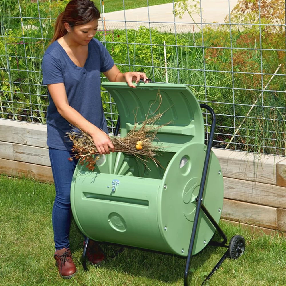 The polyester powder-coated black steel frame includes two wheels so you can take the compost right to your flower beds and garden areas. You can add to it every day for continuous composting.