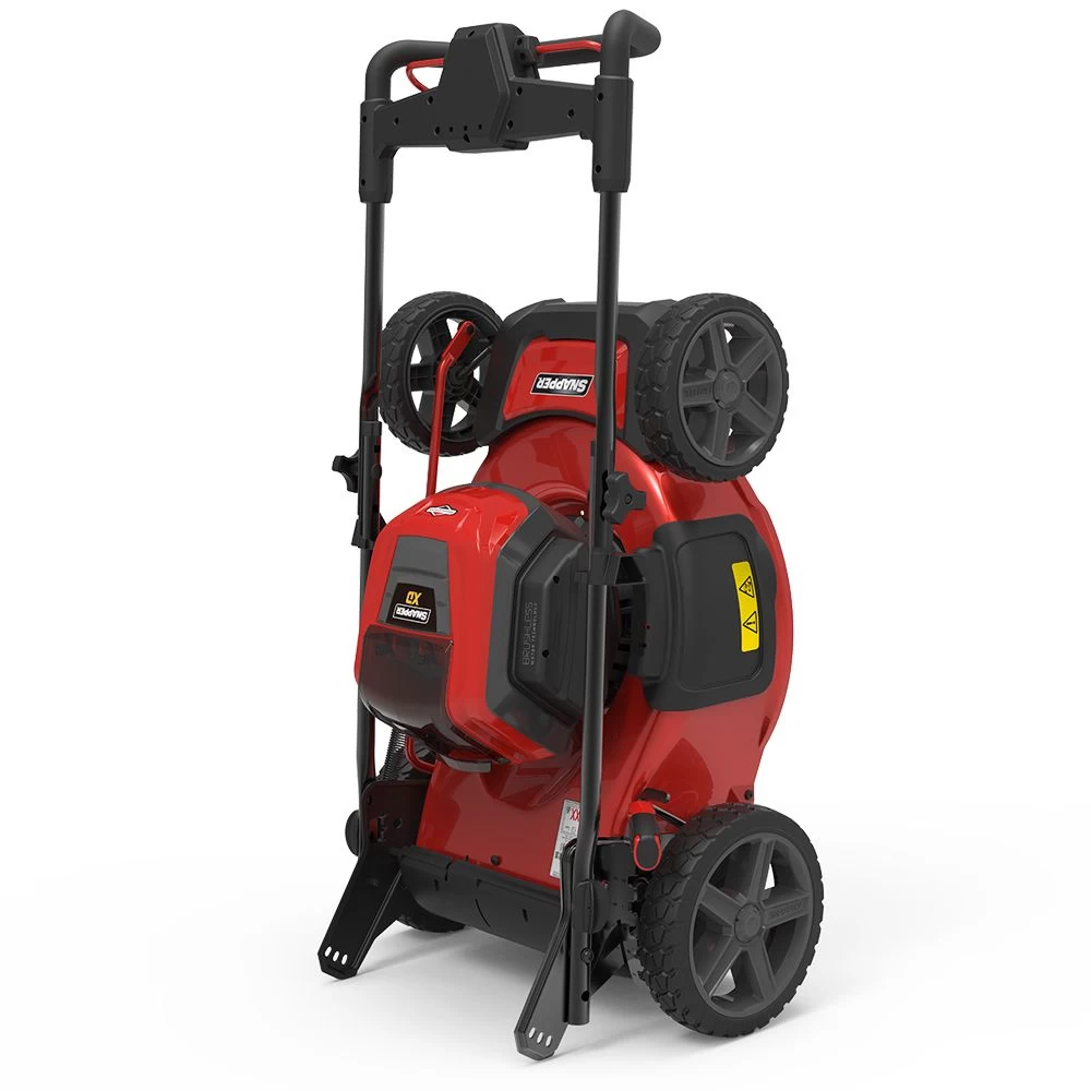 The Snapper mower’s overmoulded rubber handle provides an ergonomic grip and comfort, whilst easy to reach touchpoints including the push-button start to enhance the user’s experience. Further practicalities are the quick release and lock in holes on the handles and the machines ability to be stored vertically. Particularly useful when storage space is tight.