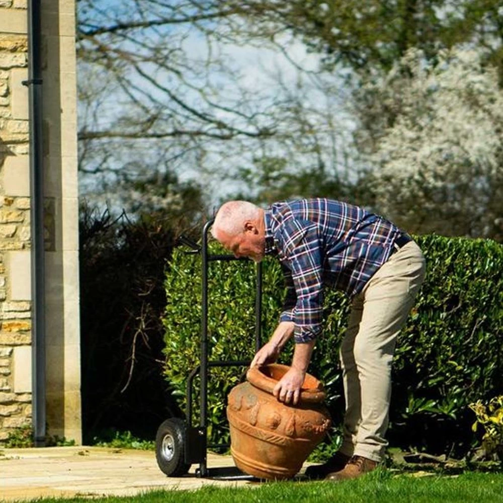 Equipped with 25cm pneumatic wheels with roller bearings, The Handy heavy duty folding sack trolley has wheel guards to help keep the load clean and dry when the terrain is wet or muddy.