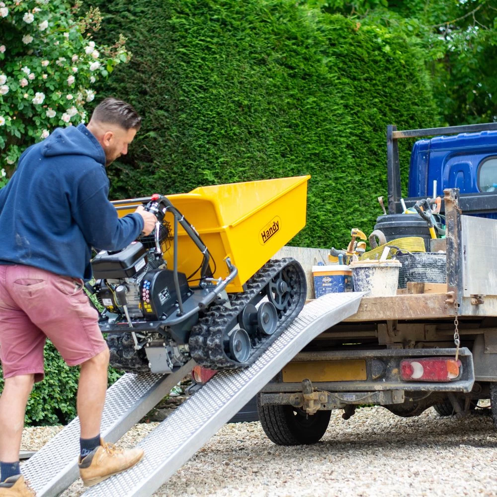 The Handy THLC09715 mini transporter will allow you to shift up to 300kg of materials in landscaping and mini construction applications. The machine runs along two 180mm wide continuous tracks for stability and traction, which cover the six wheels to give a smooth and steady ride, even over the roughest, most inaccessible terrain. The hopper (which measures 86cm in length, 63cm in width and 29cm in depth) has a useful dump function to help empty the contents easily before loading up again.