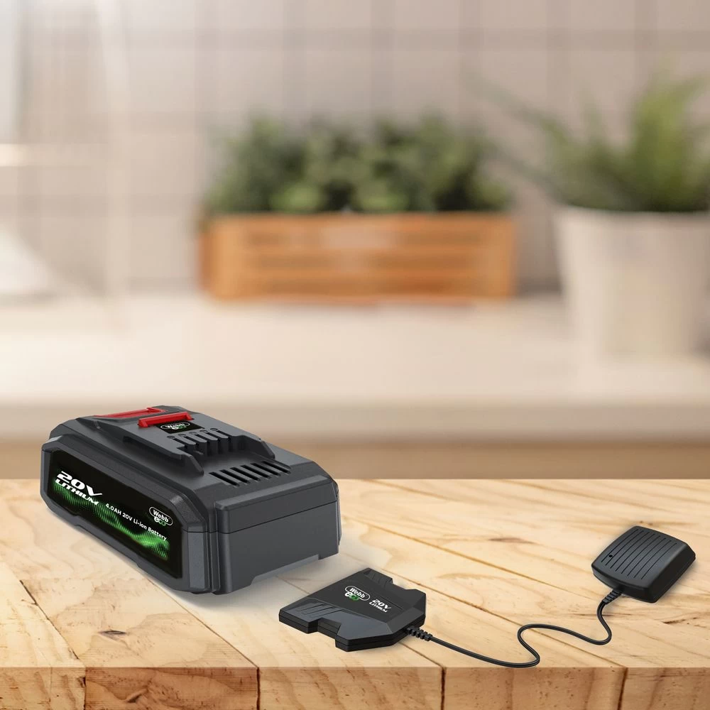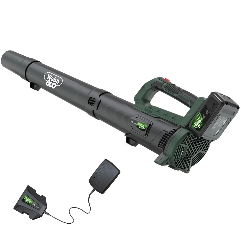 The Eco WEV20ABB4 axial blower, from trusted British brand Webb, is powered by a 20 volt lithium-ion battery which provides the freedom to wander without the restraint of a mains power cord or the fuss, mess and fumes of a petrol-powered machine. The 4.0Ah battery provided delivers up to 19 minutes of run time and takes around 160 minutes to recharge.