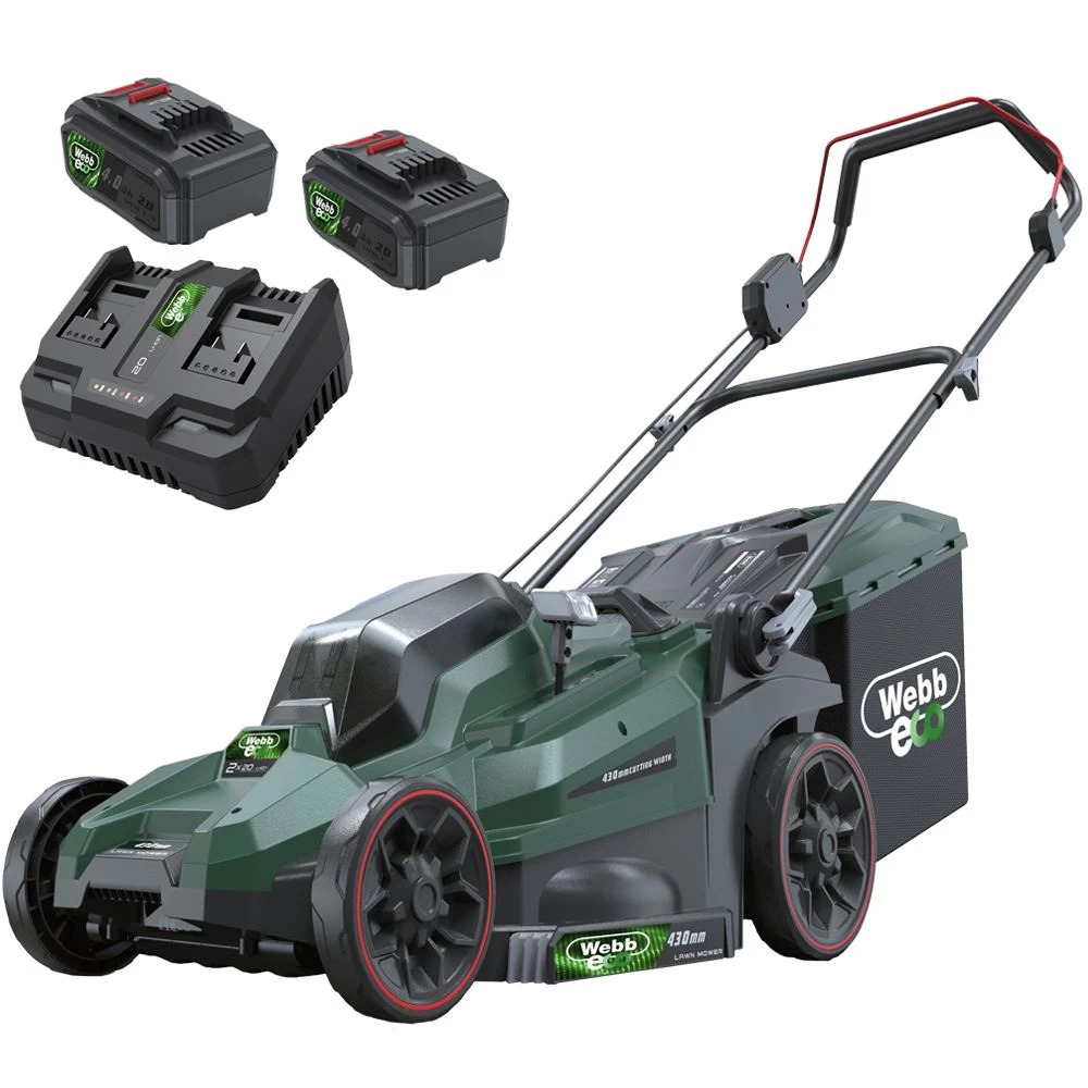 The Webb Eco WEV20X2LM43B4X 40V 43cm rotary cordless lawn mower is a cutting-edge, cordless solution designed for medium to large lawns.